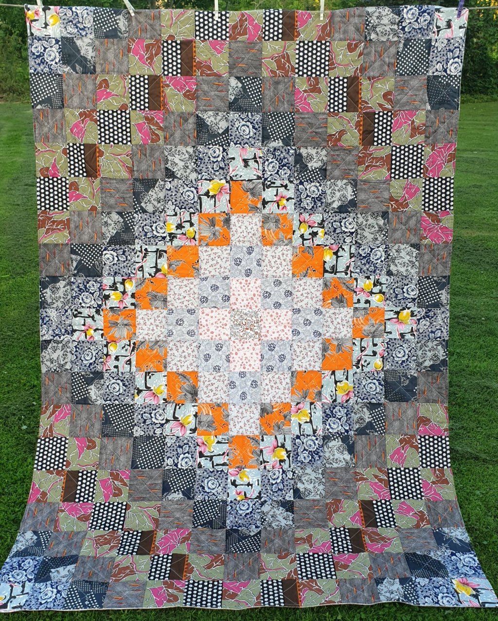 Siin on voodikate proua Luule kangastest. Igaüks neist seostub talle mõne nooruspõlve mälestusega. Soov oli, et heledad kangad saaksid keskele ja tumedad äärte poole. Ja et kõik oleks kerge ning 100% naturaalne, ei kasutanud me seekord voodriks mahuvatiini. Selle asemel läks käiku üks vana ülipehme flanellitükk. Panin selle kahekordselt. Siin all on pildilt näha, kuidas selline kate kokku "voltub": tal ei ole erilist kohevust, sellevõrra aga langeb ta oma raskusega ihu ümber ülimõnusalt. Kusjuures ei ütleks, et ta oleks külm: flanell on naha vastus üsna soe. Hea vooderdusvariant ka näiteks piknikutekkide puhul, kui omaette väärtuseks on kompaktne kokkupakitavus.